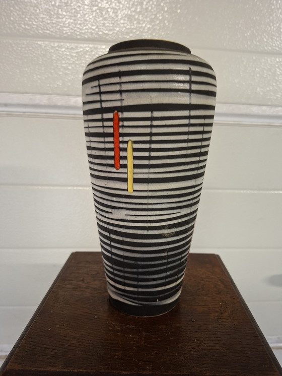 Questo splendido vaso della Germania Ovest è un esempio di maestria artigianale e stile. Con le sue accattivanti strisce bianche e nere e i delicati accenti rossi e gialli, aggiunge un tocco di raffinatezza a qualsiasi interno. Realizzato in ceramica di alta qualità, garantisce un aspetto resistente ed elegante.