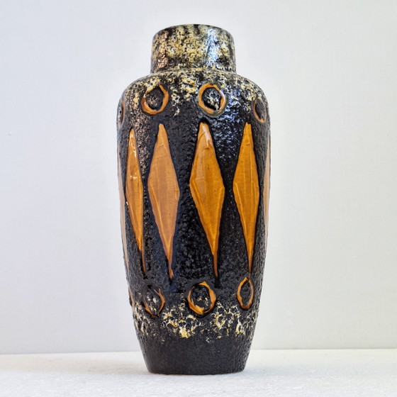 Bellissimo vaso da terra Fatlava degli anni Settanta, prodotto dal produttore tedesco Scheurich e decorato con "Gabun". Marcato sul fondo. Il vaso è ricoperto da uno smalto Fatlava nero con un motivo a rombi color ocra. È alto 30 cm.
