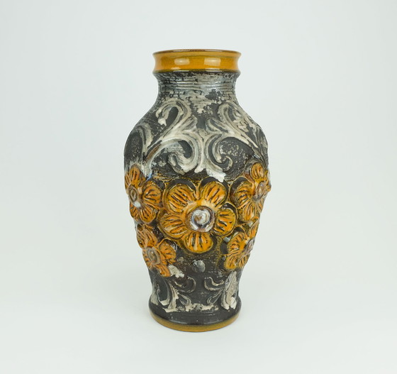 Bellissimo vaso in ceramica degli anni '60 prodotto da Carstens Toennishof, Germania Ovest. Modello 7161-30 con una splendida combinazione di motivi e smalti: decoro floreale in rilievo arancione abbinato a decori ornamentali in marrone grigiastro e grigio argento. Ottime condizioni, senza danni. Dimensioni in cm: altezza 31 cm, larghezza 17 cm. Dimensioni in pollici: altezza 12,2", larghezza 6,69". Peso 1400 g.