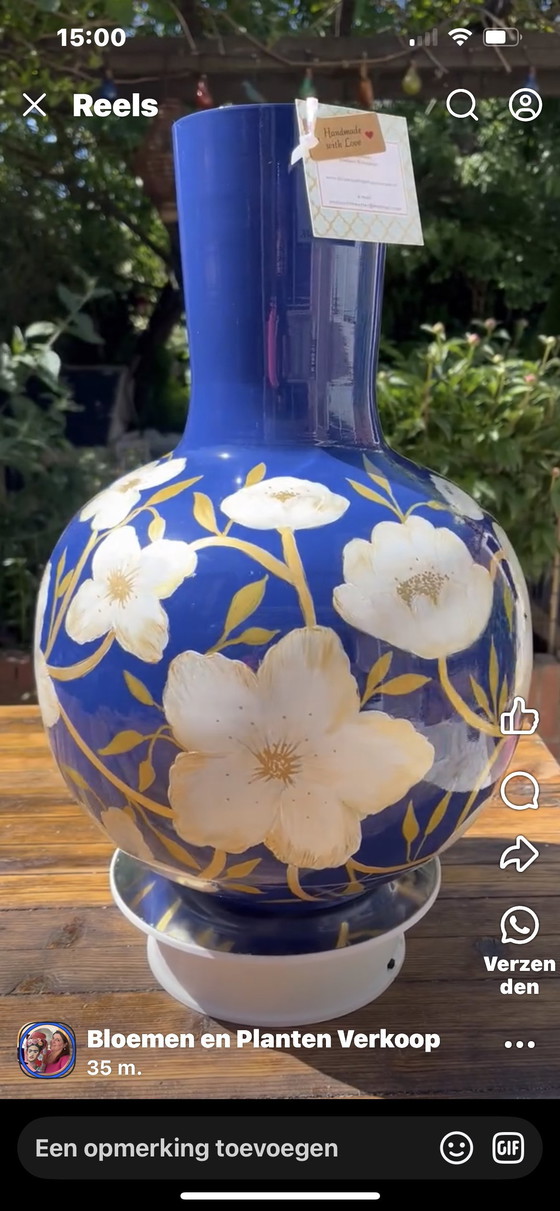 Questo splendido vaso dipinto a mano è un pezzo unico che emana eleganza e maestria. Realizzato in metallo, il vaso presenta uno sfondo blu intenso con delicati fiori bianchi e accenti dorati. Il design è classico e senza tempo, perfetto per qualsiasi interno. Il vaso è stato realizzato con amore e precisione e rappresenta un'aggiunta preziosa alla vostra casa o un regalo speciale.
