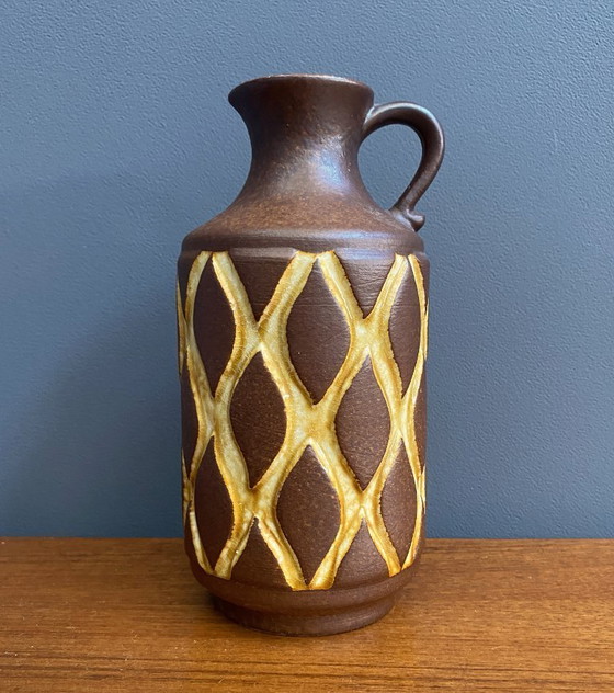 Uno squisito vaso Ilkra degli anni '60, modello 1541-18. Vera rappresentazione del design di metà secolo, questo pezzo in ceramica vanta un esterno marrone intenso decorato con un sorprendente motivo geometrico giallo che cattura lo sguardo. L'interno sorprende con un rinfrescante tocco di blu, aggiungendo un contrasto unico che ne esalta il fascino visivo.