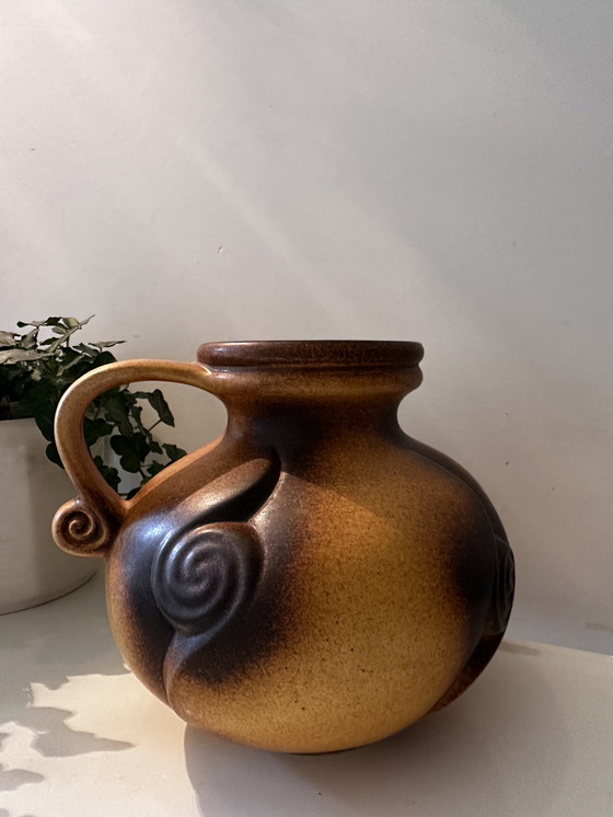 Caratteristico vaso in ceramica con manico e caratteristico rilievo di Bay Keramik. Prodotto nella Germania Ovest intorno agli anni '70. Smalto color marrone-ocra caldo. Q773 Marchio: Bay Keramik Prodotto in: Germania Ovest Periodo: ca. 1970 Materiale: Ceramica Colore: Marrone/ocra con rilievo a spirale Altezza: circa 17 cm di larghezza, 19 cm di profondità, 16 cm