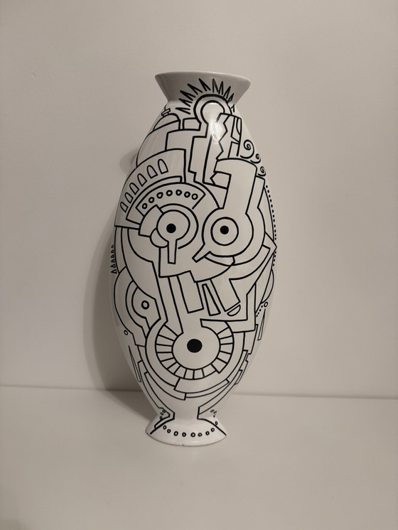 Vaso in ceramica bianca con segni neri. Presenta un marchio di attribuzione che ne indica il numero 7 nella collezione. Misura circa 37 cm di altezza e 20 cm di larghezza e pesa circa 0,8 kg. Designer: Alessandro Guerriero. Periodo: 2000. Paese di origine: Italia.