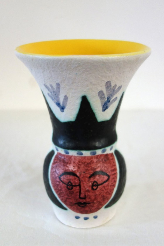 Vaso in ceramica di Jacques Sagan, Vallauris anni '50/'60. Forma a balaustro con collo aperto, decorazione geometrica con testa stilizzata su fondo bianco granuloso. L'interno è ricoperto da uno smalto giallo brillante Firma autografa sotto la base "J. Sagan Vallauris", che attesta l'esistenza di un vaso in ceramica di Jacques Sagan. Sagan Vallauris", che ne attesta l'autenticità e la provenienza.