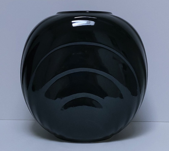 Vaso di design in ceramica con smalto nero lucido e motivi semicircolari in rilievo. Opera tedesca degli anni '80, marcata e numerata in rilievo sotto la base (vedi foto e zoom). Ottime condizioni generali. Altezza totale 20 cm. Larghezza totale 20 cm.