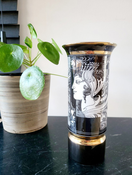 Vaso in porcellana Hollohaza, designer: Endre Szasz, Ungheria, 1926–2003. Vaso in porcellana composto da toni neri e dorati su porcellana bianca. Endre László Szász è stato un grafico, designer, pittore, illustratore e decoratore di ceramiche ungherese. Firmato sul fondo. Dimensioni: lunghezza 20 cm, diametro Ø 9 cm.
