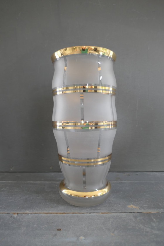 Vaso in vetro Art Deco Booms dell'Abbazia di Spermalie a Sijsele. L'Abbazia di Spermalie è un'ex abbazia cistercense nella città fiamminga occidentale di Sijsele. Motivo geometrico sabbiato con finitura dorata. Altezza 30,5 cm, diametro 13,8 cm. In ottime condizioni.