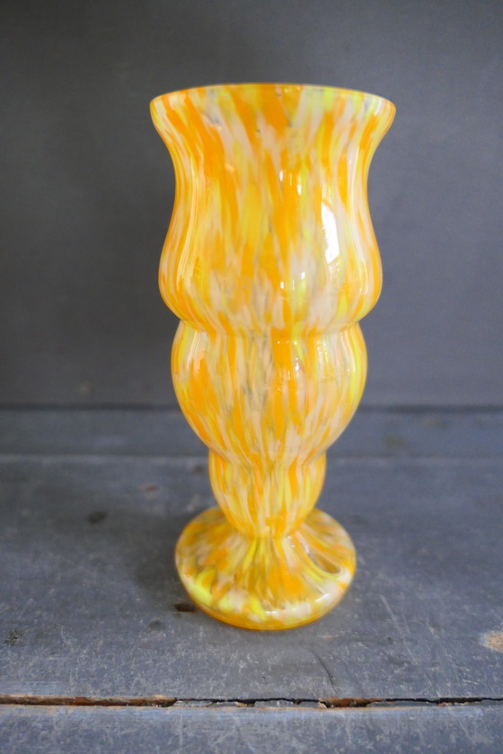 Vaso in vetro spruzzato vintage Franz Welz arancione giallo