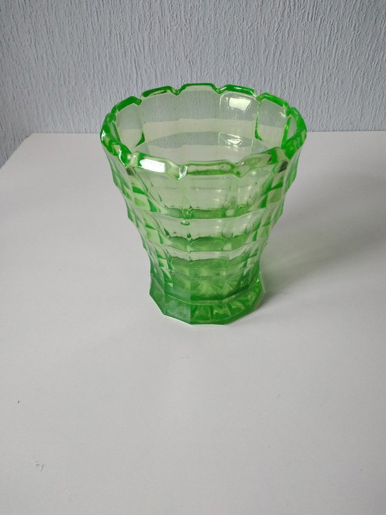Questo bellissimo vaso in vetro uranio, noto anche come vetro anna, è un pezzo autentico degli anni '30 prodotto da Leerdam. Con un'altezza di 16,1 cm e un diametro di 13,5 cm nella parte superiore e di 10,5 cm in quella inferiore, questo vaso è uno splendido esempio di design Art Déco. Il vetro ha un vibrante colore verde caratteristico del vetro uranio e il pezzo è in perfette condizioni senza alcun difetto. Un oggetto da collezione ideale per gli amanti della vetreria d'epoca.