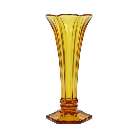 Questo splendido vaso Art Déco presenta un colore ambrato caldo e brillante. La sua origine si può trovare nel catalogo LUXVAL pubblicato nel 1935. Questa serie è stata prodotta in vari colori, tra cui il più comune è l'ambra.