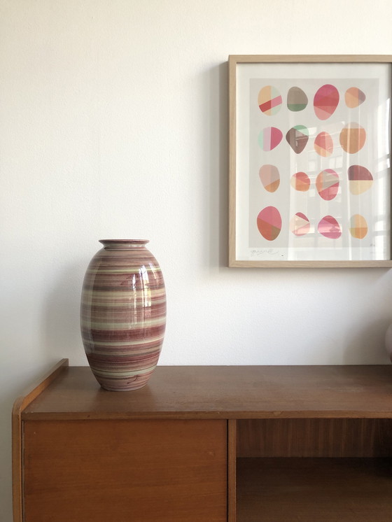 Vaso in ceramica multicolore disegnato da Joke Stroes (1942-2010) per Mobach Utrecht. Firmato in basso da Joke Stroes ("JS").