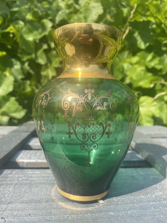 Questo squisito vaso in vetro di Murano testimonia l'eleganza senza tempo dell'artigianato italiano. La sua ricca tonalità smeraldo è splendidamente completata da intricati dettagli in oro 24 carati, che lo rendono un pezzo forte per qualsiasi interno sofisticato.