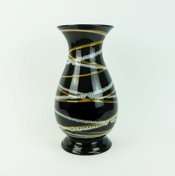 Vaso in ceramica della Germania occidentale di metà secolo, prodotto da Scheurich Keramik alla fine degli anni '50 (1959). Bella variante decorativa. Smalto nero lucido con strisce ocra, bianche e grigio chiaro e bianche. Interno smaltato di ocra.