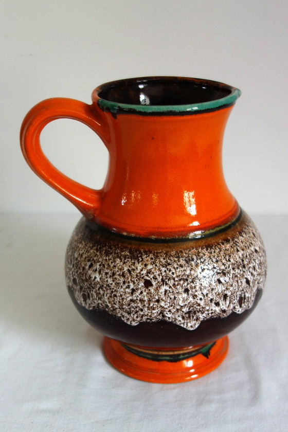 Vaso con manico della Germania occidentale, prodotto in Germania da U Keramik, anni 1960/70. Colore arancio e terra, smaltato e lucidato. Numerato 1794/25. Altezza 26 cm
