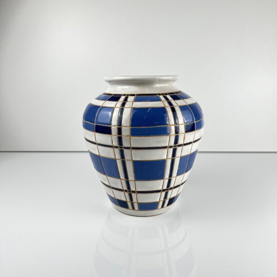 Antico vaso in terracotta smaltata, risalente agli anni '50, con decorazione grafica geometrica blu e bianca in stile scacchiera