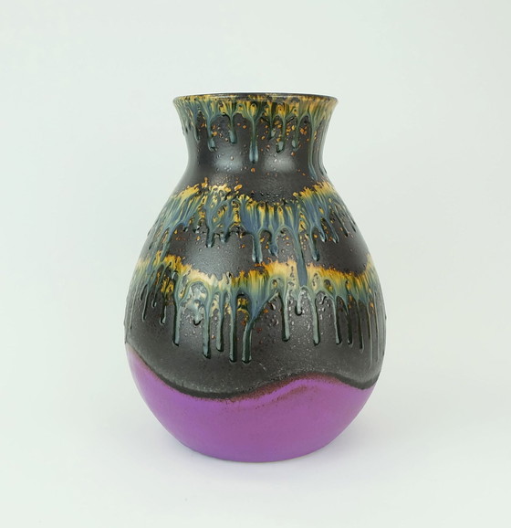 Un vaso vintage di gran classe e bellezza di Dümler & Breiden degli anni '60. Smalto opaco prevalentemente color antracite con smalto a goccia nei toni del caramello, ruggine e verde, abbinato a smalto viola. Marcato sul fondo: DB 122/30 Germania. Ottime condizioni, senza scheggiature o crepe. Dimensioni in cm: altezza 30 cm, diametro massimo 24 cm. Dimensioni in pollici: altezza 11,81", diametro massimo 9,44". Peso 2100 g.