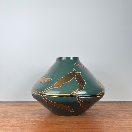 Vaso in ceramica smaltata verde e oro 1970/80 Dimensioni: Diametro: 28 cm Altezza: 21 cm Oggetto antico, conserva tracce del tempo e difetti di fabbricazione, vedi foto