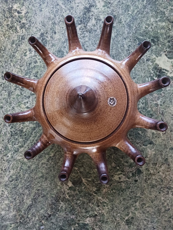 Scopri questo esclusivo vaso/lampada a olio in ceramica a forma di tulipano degli anni '70, un vero e proprio colpo d'occhio per i tuoi interni. Con le sue calde tonalità di marrone e la finitura artigianale, questo pezzo porta un tocco di fascino vintage in qualsiasi stanza. Perfetto per esporre fiori o come lampada a olio d'atmosfera.