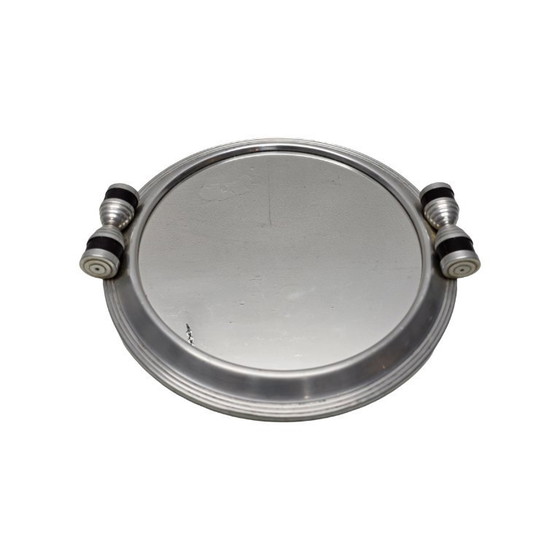 Questo vassoio francese Art Déco con specchio è un bellissimo esempio dell'elegante design degli anni Venti e Trenta. Il vassoio rotondo è rifinito con una combinazione di cromo e legno, materiali caratteristici del periodo Art Déco.