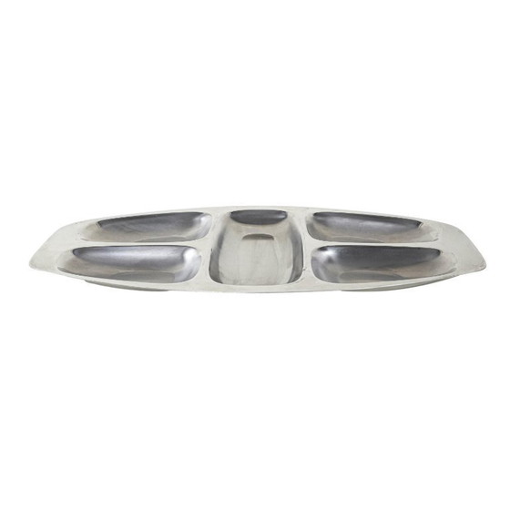 Realizzato in acciaio inox di alta qualità, caratteristica del marchio Alessi, presenta cinque scomparti separati, ideali per servire snack, antipasti o frutta. Un design minimalista e funzionale, tipico del design italiano di quel periodo. Un pezzo senza tempo in stile Mid-Century Modern.