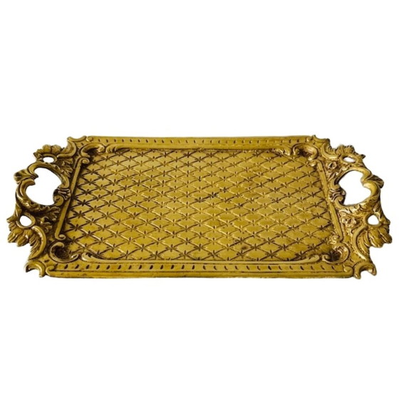 Vassoio rettangolare d'epoca in ottone francese con decorazioni barocche degli anni Trenta.