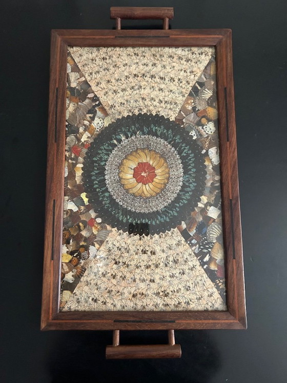 vassoio in legno intarsiato decorato con ali di farfalla sotto vetro 1970