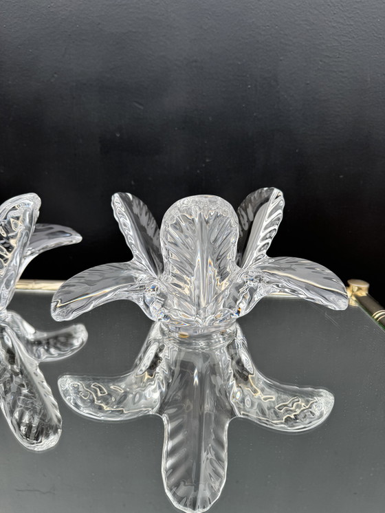 Deliziosa coppia di vassoi portaoggetti (o portacandele...) in cristallo massiccio di Vannes degli anni '70, a forma di palma; condizioni eccellenti.