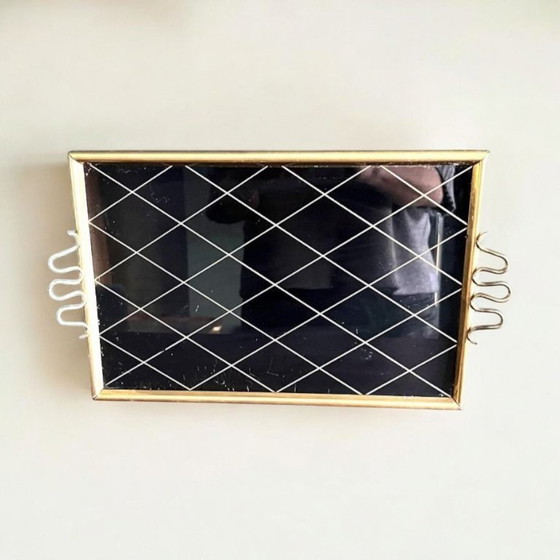 Bellissimo vassoio degli anni '50. Realizzato in metallo nero con piano in vetro decorato con diamanti dorati. Molto bella la maniglia in ottone curvato.