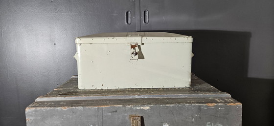 L'esterno è verniciato grigio chiaro/crema, ma sotto la vernice è visibile uno strato verde scuro più vecchio. Questo indica un utilizzo precedente, probabilmente in ambiente militare o tecnico. Un timbro di produzione è impresso sul coperchio.