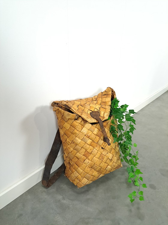 Antico cesto per la raccolta della frutta proveniente dalla Svezia. Il cesto è fatto di corteccia e veniva utilizzato per raccogliere la frutta. La chiusura e le cinghie sul retro sono in pelle. Il cesto è un grazioso oggetto decorativo con alcune piante al suo interno. Il cesto è in condizioni usate con evidenti segni di usura, coerenti con la sua età. Il legno e la pelle sono antichi, quindi il cesto può essere utilizzato come elemento decorativo. Dimensioni: Larghezza: 48 cm, Profondità: 25 cm, Altezza: 55 cm