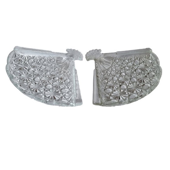 Questi bellissimi portasapone in vetro vintage a forma di ventaglio donano un tocco di nostalgia ed eleganza al vostro bagno o alla vostra toilette. Prodotti in Francia negli anni '70, questi portasapone in vetro pressato non sono solo pratici, ma anche un vero e proprio richiamo visivo in qualsiasi interno. In ottime condizioni, non presentano scheggiature.