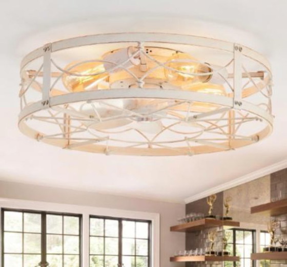 Design a gabbia vintage - Questo ventilatore da soffitto a gabbia bianco-oro presenta 7 pale in ABS all'interno di una resistente gabbia metallica, che fonde motivi circolari e geometrici per un aspetto equilibrato e sostanziale. La finitura bianco-oro anticata aggiunge un tocco di fascino vintage, rendendolo ideale per creare un'atmosfera calda e accogliente in camere da letto, cucine e soggiorni. Perfetto per un arredamento rustico o tradizionale.