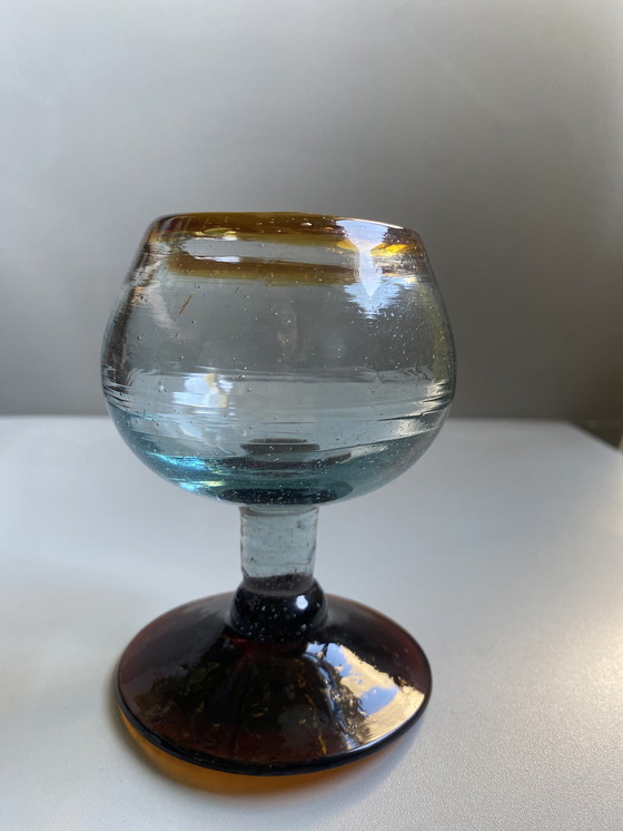 Questo squisito bicchiere da brandy di Murano è una testimonianza dell'arte senza tempo dell'arte vetraria veneziana. Lo spesso vetro soffiato a mano è caratterizzato da delicate bolle, che creano una texture visiva accattivante che ne esalta l'eleganza. Le sfumature marroni e turchesi sommerse aggiungono un tocco di raffinatezza, rendendolo un'aggiunta perfetta a qualsiasi collezione raffinata.
