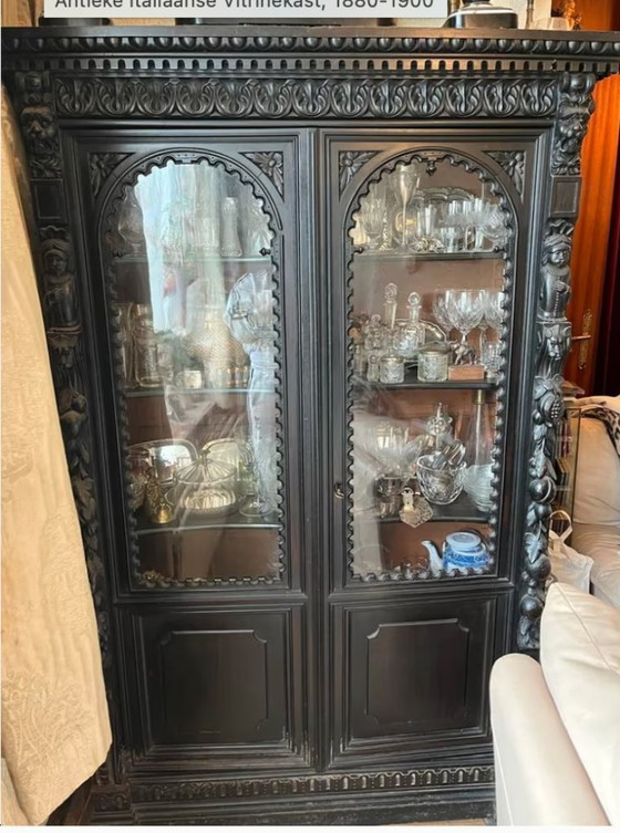 Splendida vetrina italiana in patina scura, risalente al periodo 1880-1900. Realizzata in noce, la vetrina è riccamente decorata con intagli sulla cappa e sugli angoli. Le due ante a pannello presentano finestre, anch'esse con delicati intagli. Questa vetrina originale è in buone condizioni, non restaurata e presenta ancora i suoi supporti originali. Dimensioni: 180 cm di altezza, 118 cm di larghezza e 41 cm di profondità.