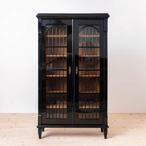 Questa bella vetrina proviene molto probabilmente dall'Austria ed è stata realizzata intorno alla metà del XIX secolo, il periodo Biedermeier, mostrando un'abilità artigianale che resiste alla prova del tempo. La costruzione è in legno di pino. Dietro le ante, chiudibili con una chiave, si trovano cinque pratici ripiani regolabili in altezza. Il mobile poggia su quattro gambe affusolate che conferiscono ulteriore leggerezza. Le eleganti finiture nere conferiscono un tocco di raffinatezza al pezzo, mentre le serrature e gli accessori originali in ottone aggiungono un tocco di lusso. La vetrina è stata sottoposta a un processo di restauro professionale. La superficie è stata rifinita con lucidatura a gommalacca nera applicata a mano con un tampone fino a raggiungere un'elevata lucentezza con pori cancellati, che oltre all'eccellente effetto visivo protegge e cura il legno. Un bellissimo pezzo di arredamento che arricchirà qualsiasi collezione di antiquariato. Che siate collezionisti di tesori antichi o amanti del design classico, questa vetrina diventerà sicuramente un pezzo forte che susciterà conversazioni e ammirazione.