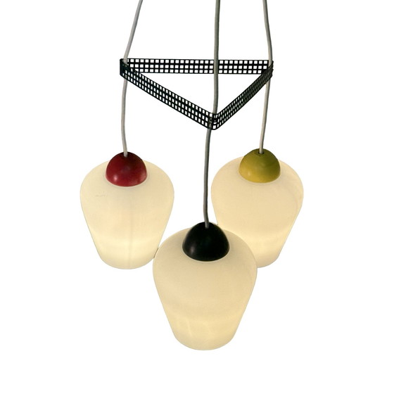 Vintage ceiling mounted lamp. Consisting out of three pendants that are kept at an even spaces by a black triangle. All lamps are adjustable in height and there is more than enough wire to get your own personel best result. The ceiling canopy is new and houses the spare wire. The lamp is in great condition and comes including the bulb and powercord. Translucent / frosted glass in top condition. In the style of Louis Kalff or Holmegaard. We found many similar pieces but not this exact one.