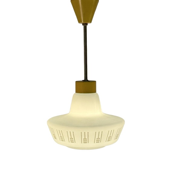 Vintage 50’s MCM Hanging pendant - Frosted / semi translucent white glass - Yellow ceiling mounted canopy and brass upright