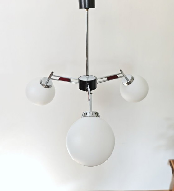 This vintage chandelier from the 1960s is a beautiful example of design that combines clean lines and a playful Space Age character. Three-pronged metal arms in chrome and black with red wood accents support three opal white glass spheres that emit a soft, even light. The lamp is distinctive enough to become the centerpiece of a room, yet it fits beautifully into both modern interiors and warmer retro styles.