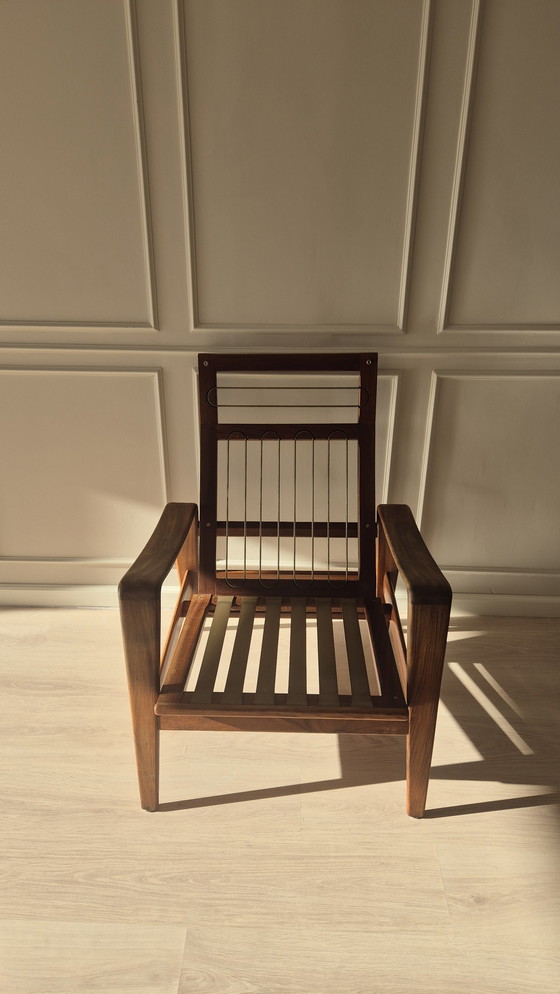Prachtige vintage Deense lounge chair uit de jaren ’60, in massief teak, toegeschreven aan Arne Wahl Iversen. Een zeldzaam en zeer gewild model, met de originele metalen rugveren en elastische zitting in nette staat.