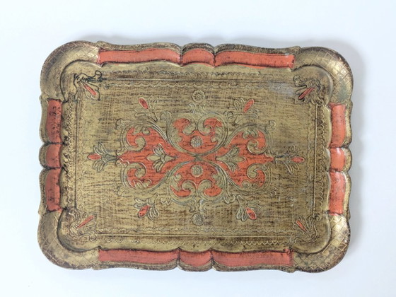 Vintage Florentine Gilt Wood Tray | Hand-Painted Orange & Gold | Midcentury Italian Baroque Decor