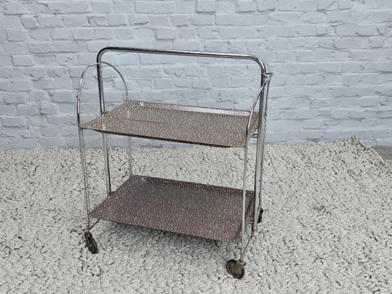 Vintage Foldable and Mobile Chrome Steel 2 Floral Decorated Layers ‘Dinett’ Serving Trolley by Gerlinol, Germany, 1970s.