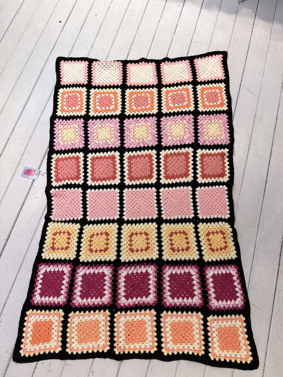 Aggiungi un tocco di nostalgia alla tua casa con questa deliziosa coperta vintage all'uncinetto. Perfetta per aggiungere un tocco di colore e calore a qualsiasi stanza, questa coperta presenta un delizioso mix di quadrati rosa, arancioni e crema bordati di nero intenso.