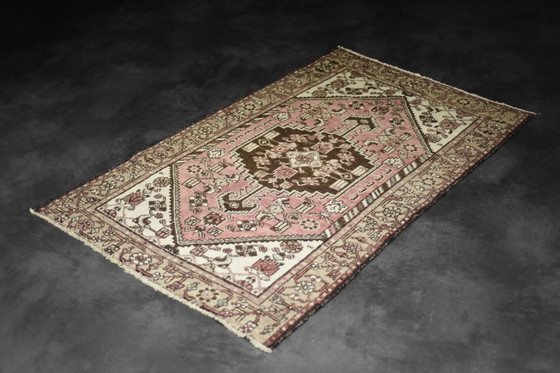 This hand-woven oriental Hamadan rug was made in Iran during the 1960s. It is flat woven carpet - woven using traditional technique. This rug is dyed in shades of rustic red, pink and purple with a strongly accentuated, single medallion, placed in the central part of the rug. It is hand-made, where every detail is thought out and refined.