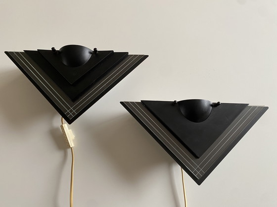 Una splendida coppia di lampade da parete triangolari postmoderne, disegnate da Herda per Smart Team Corporation. La struttura è realizzata in acciaio laccato nero-grigio chiaro e vetro acrilico. Eccellente manifattura olandese, altamente decorativa e unica.