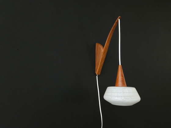 Vintage houten wandlampje met glazen kapje, hengel-model, mcm houten wandlamp met deels gematteerd, deels gesuikerd glazen lampe