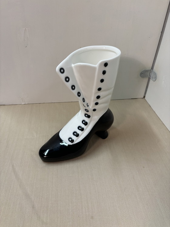 Questo è un vaso vintage unico in edizione limitata di IKEA, progettato a forma di stivale alla moda. Il vaso presenta un'accattivante combinazione di colori bianco e nero, con dettagli intricati che imitano l'aspetto di una classica scarpa con il tacco. Realizzato in ceramica di alta qualità, questo pezzo è sia un vaso funzionale che un oggetto decorativo che aggiunge un tocco di estrosità ed eleganza a qualsiasi spazio. Perfetto per i collezionisti o per chiunque voglia aggiungere un pezzo distintivo all'arredamento della propria casa.