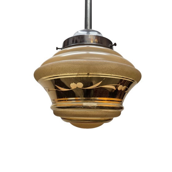 Deze prachtige vintage jaren 50 hanglamp is een sfeervolle Franse blikvanger die moeiteloos warmte en karakter toevoegt aan ieder interieur. De lamp is uitgevoerd met een lange chromen buis en een bijzondere glazen kap in zachte goudtinten. Lichte gebruikerssporen op het chroom.