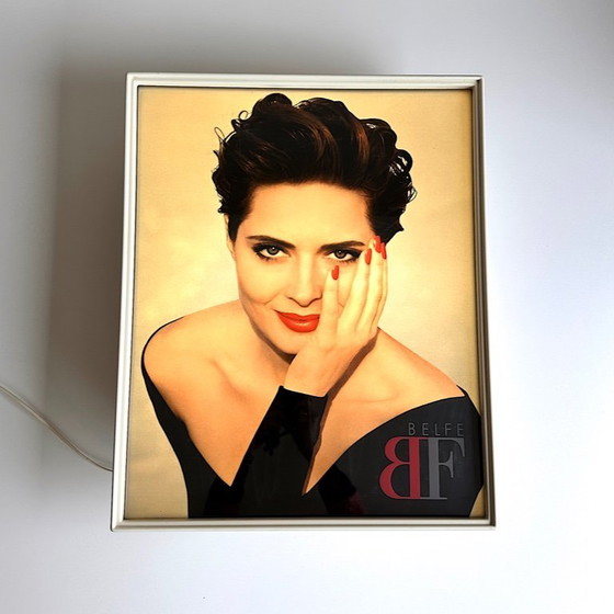 Stil/Design/Form: Umwerfend schöne Leuchtreklame mit einem Portrait von Isabella Rossellini von Opticart für die italienische Mode-Firma Belfe. Weißes Kabel mit Drückerschalter. Ausgestattet mit einem neuen Leuchtmittel (Osram Leuchtstofflampe L 32W/840 Circular, Cool White 2100 lm)
