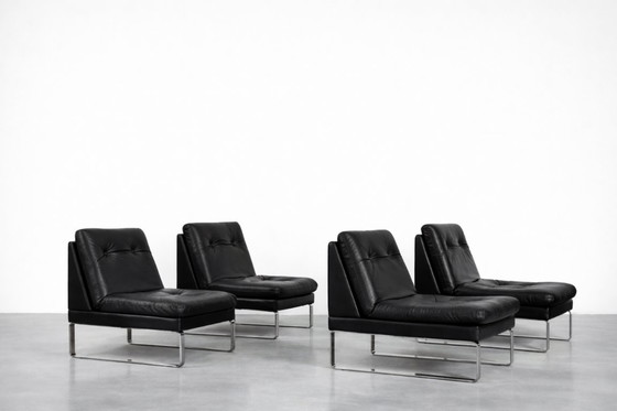 This modular sofa or a set of four single armchairs was produced by the German manufacturer Klöber in the Postmodernism era. Klöber is an international manufacturer of high-quality furniture designed to the highest ergonomic standards. The armchairs are fully upholstered in high-quality black natural leather. The seat and backrest are formed by a loosely folded cushion. The minimalist base is made of steel.