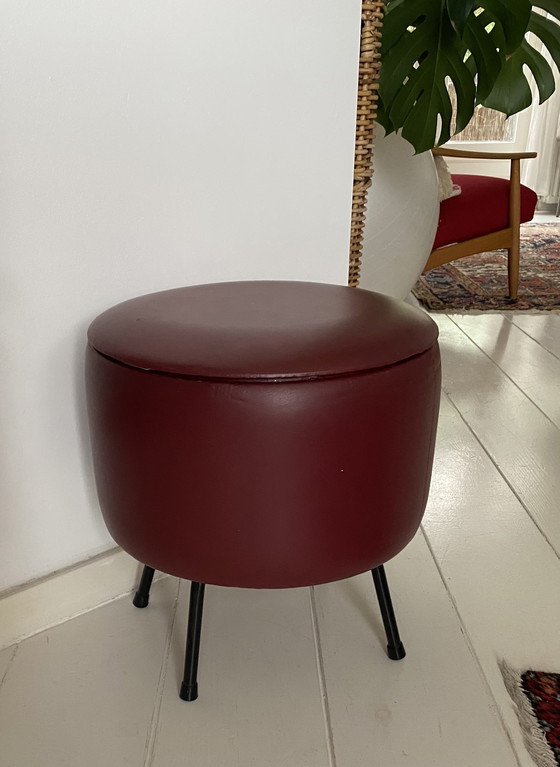 Questo è un affascinante cestino da cucito vintage degli anni '60, caratterizzato da un classico esterno in pelle skai in un ricco colore rosso. Il cestino poggia su robuste gambe in metallo nero che garantiscono stile e stabilità. L'interno è spazioso, perfetto per riporre materiale da cucito o altri piccoli oggetti. Il pezzo è una deliziosa aggiunta a qualsiasi arredamento vintage o a tema retrò, offrendo sia funzionalità che un tocco di nostalgia.